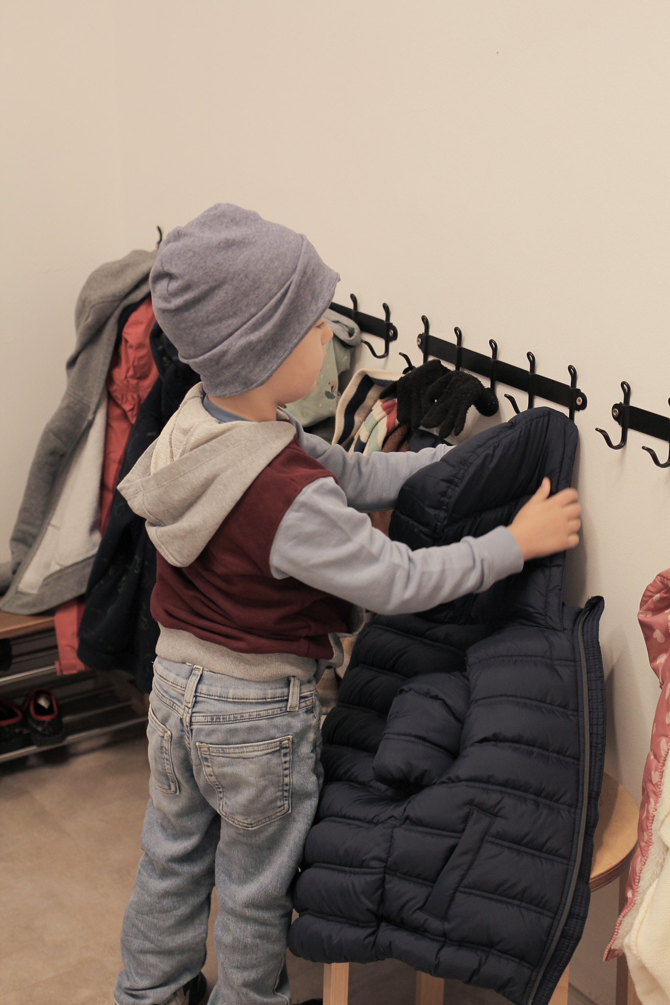 Schon beim Ankommen spürt man die besondere Atmosphäre: liebevoll, ruhig, achtsam. Jedes Kind wird persönlich begrüßt – wir nehmen uns Zeit für ein paar Worte mit den Eltern und dafür, dass jedes Kind in seinem eigenen Tempo ankommen darf. Denn was für Erwachsene oft Routine ist, ist für die Kleinsten ein wichtiger Teil des Lernens: selbstständig sein dürfen. Schuhe ausziehen, Jacke aufhängen, den eigenen Platz finden – das braucht Zeit, und die geben wir ihnen gerne.